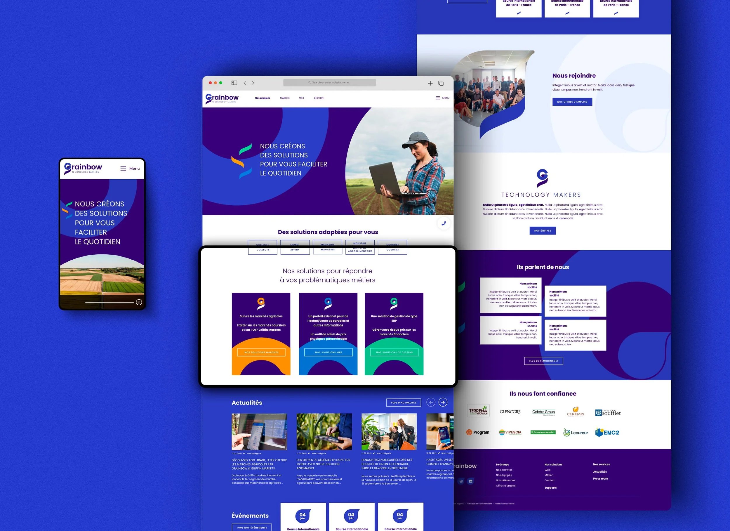 Afin de rendre la communication plus visible, plusieurs éléments ont été conçus : un bloc marque corporate au nom du groupe GRAINBOW, des blocs marques par gammes de produits, des familles de pictogrammes et une communication imprimée et digitale.