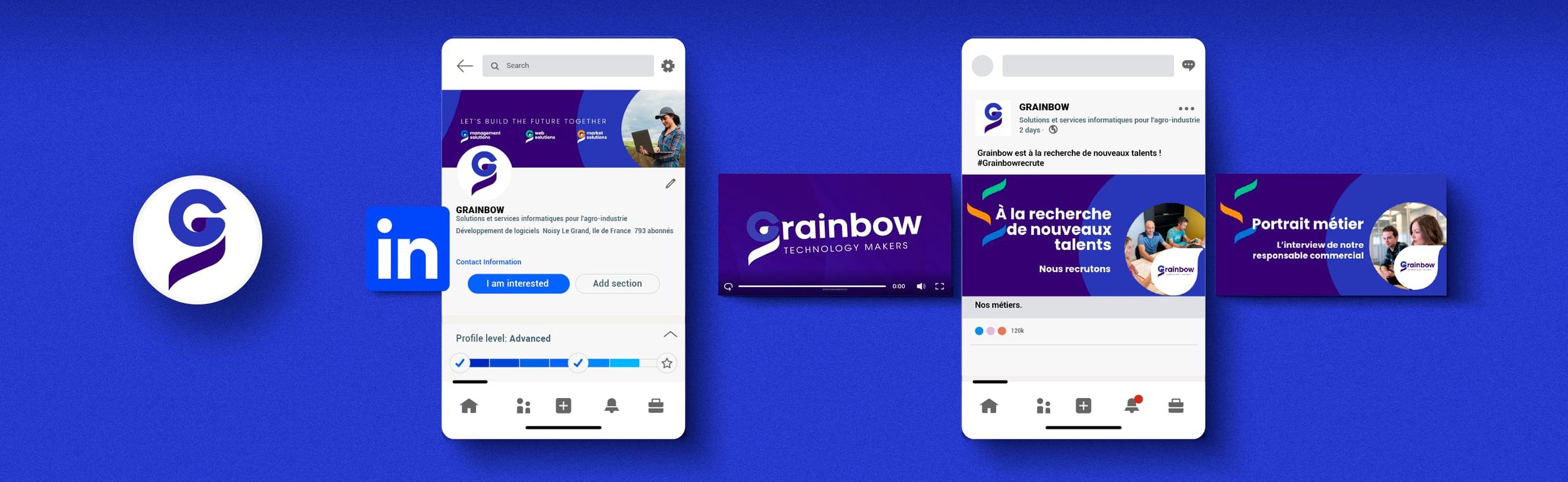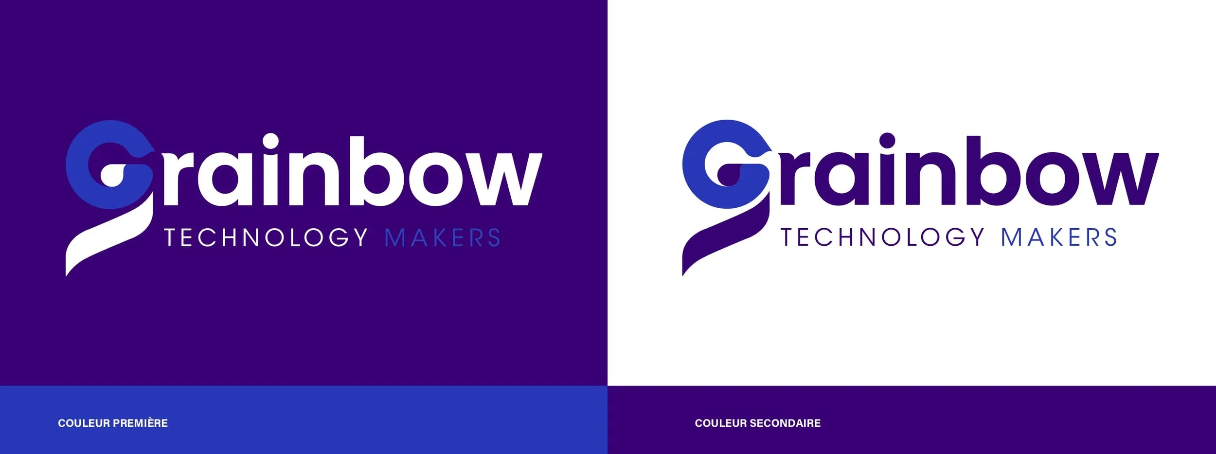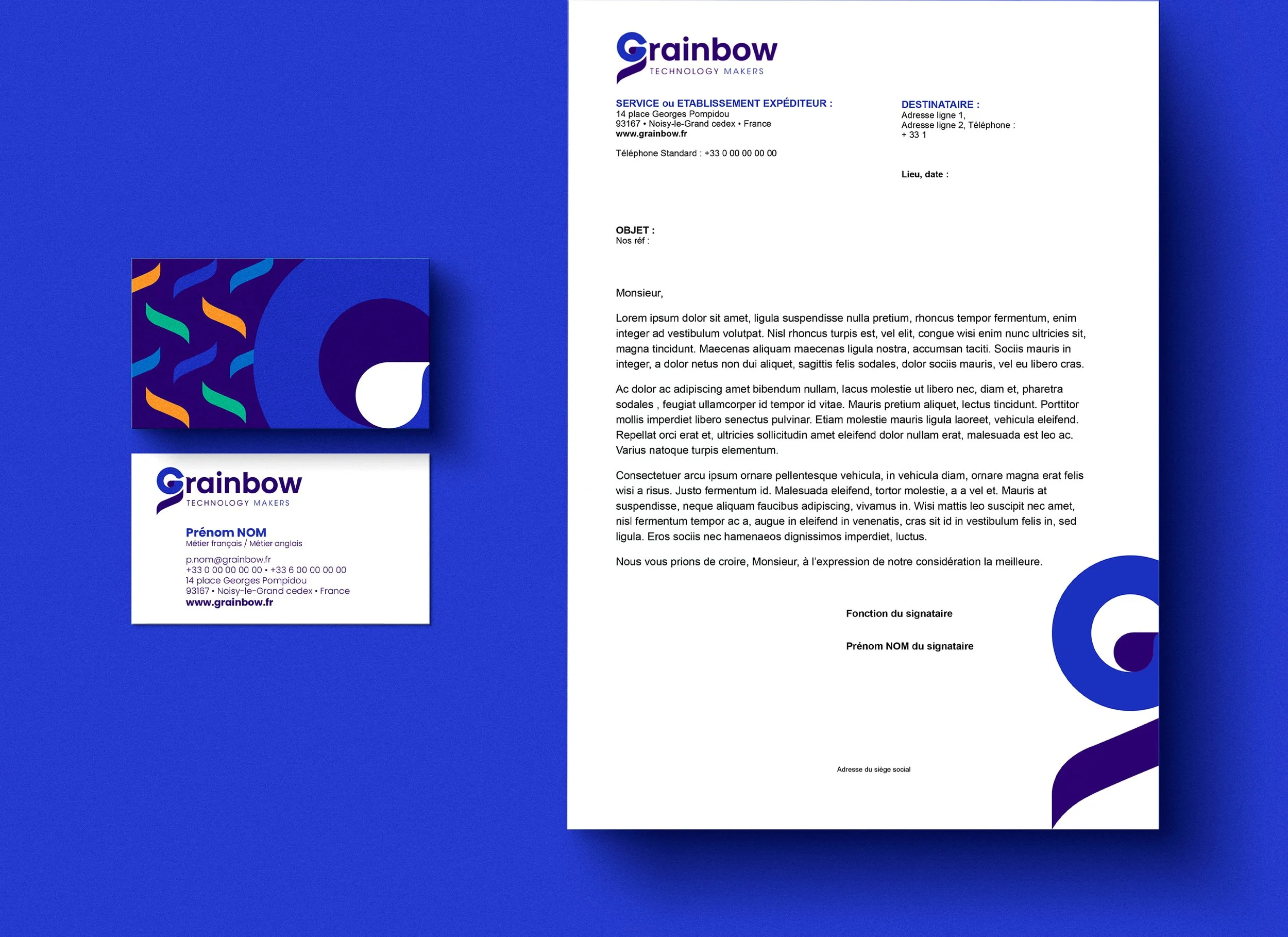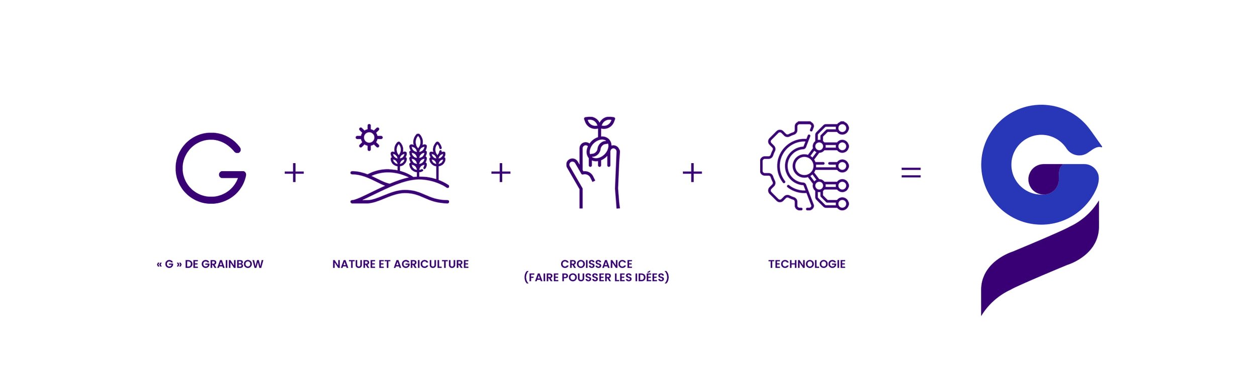 L’élément graphique du bloc marque (la lettre G de Grainbow) appuie l’envie créatrice du groupe : « Chez GRAINBOW, nous créons des technologies pour faciliter le quotidien de nos clients ». Il est le vecteur d’attachement qui concrétise l’initiative: « donner l’impulsion, faire le lien, la relation et susciter l’intérêt autour de valeurs communes ».