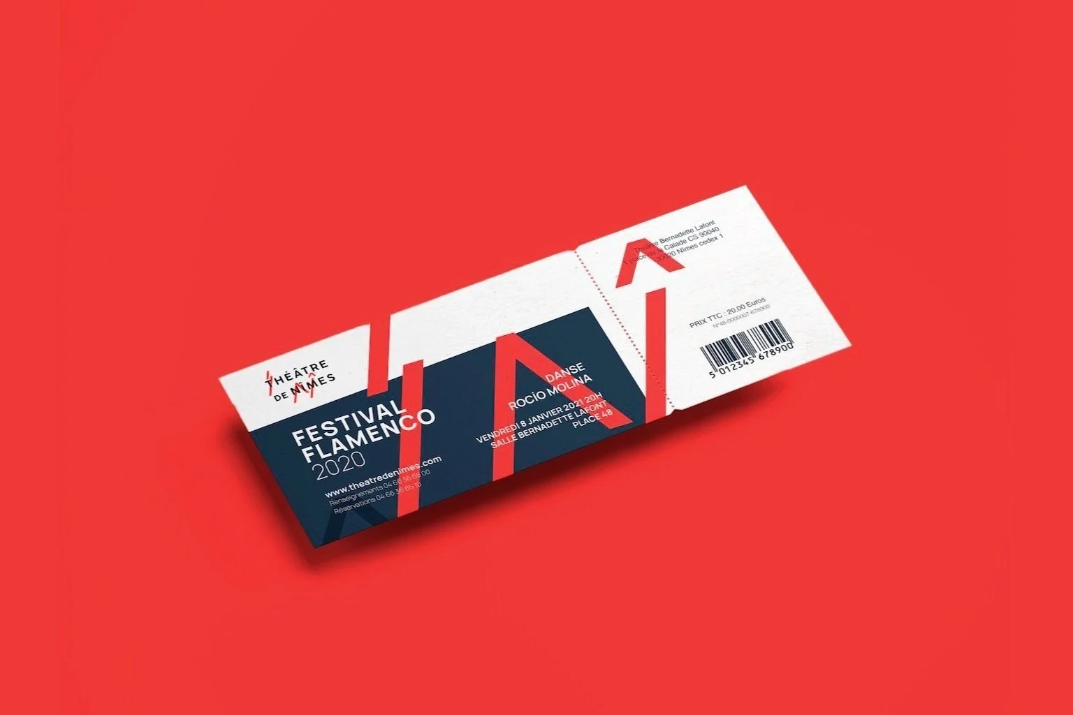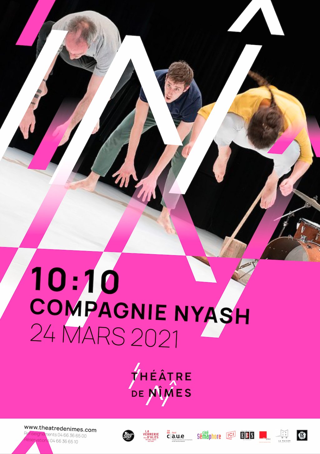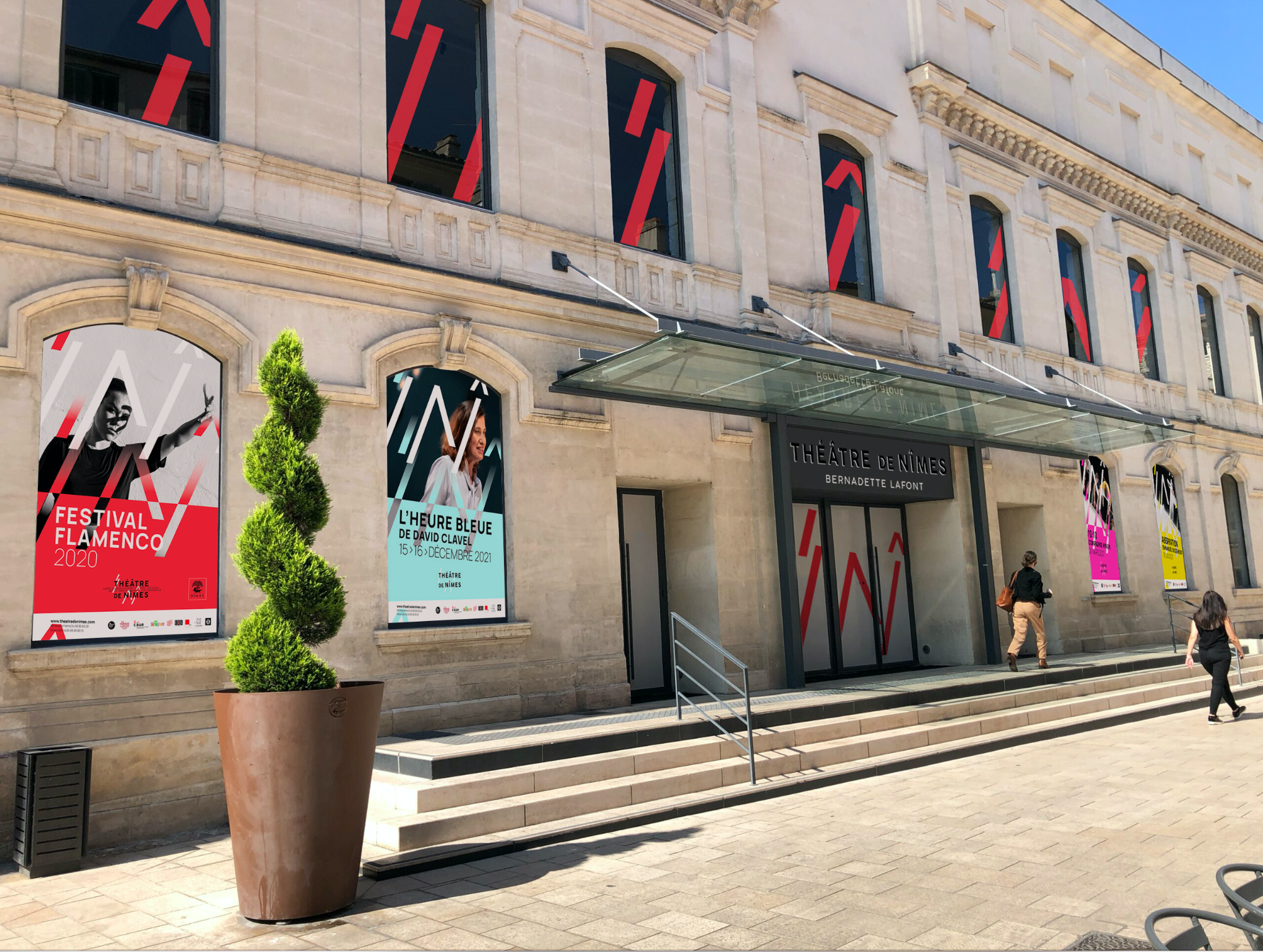 Dans une volonté d'être vivante et respirante, la typographie s'aère naturellement pour faire circuler des espaces d'expression tel des passages dans le théâtre. Elle permet ainsi d'accueillir l'objet graphique qui va rythmer l'ensemble visuelle comme deux corps de danseurs en mouvement. Cet objet est le langage d'expression du Théâtre de Nîmes chorégraphié par les lettres destructurées "T" (théâtre), "N" – "î" (Nîmes). Déconstruire la typographie pour créer et donner corps au logotype dans son ensemble.